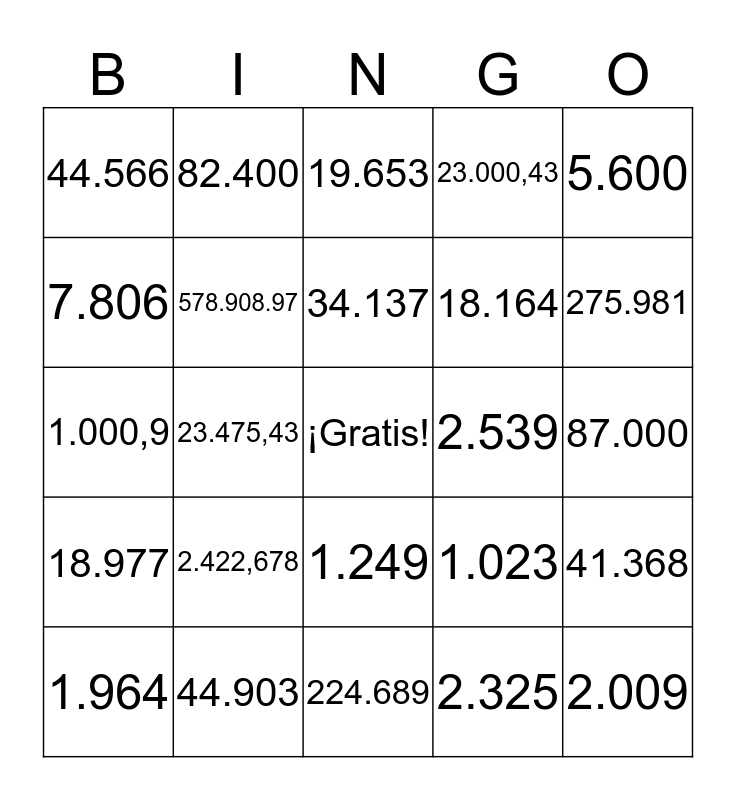This bingo card has a free space and 26 words: 1.249, 2.325, 34.137, 44.903, 5.600, 44.566, 7.806, 82.400, 87.000, 1.023, 18.164, 1.000,9, 41.368, 1.964, 23.475,43, 1.679, 23.000,43, 18.977, 19.653, 2.009, 275.981, 224.689, 2.539, 2.422,678, 578.908.97 and 32.374.