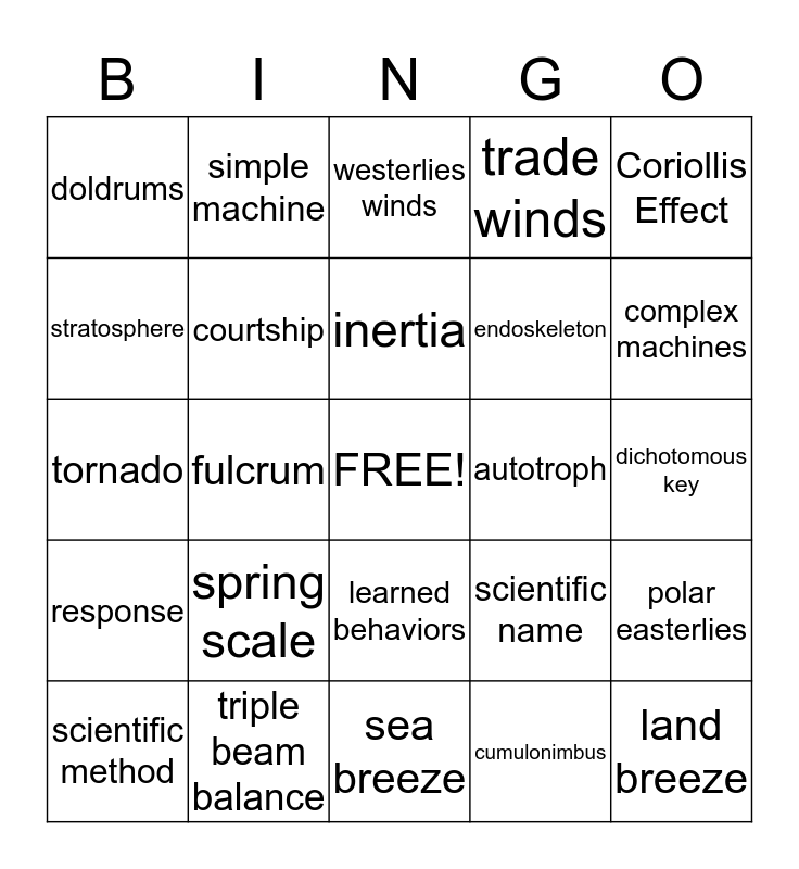 This bingo card has a free space and 24 words: spring scale, triple beam balance, inertia, scientific method, Coriollis Effect, doldrums, stratosphere, simple machine, autotroph, learned behaviors, endoskeleton, tornado, scientific name, polar easterlies, courtship, cumulonimbus, dichotomous key, westerlies winds, complex machines, fulcrum, land breeze, response, trade winds and sea breeze.