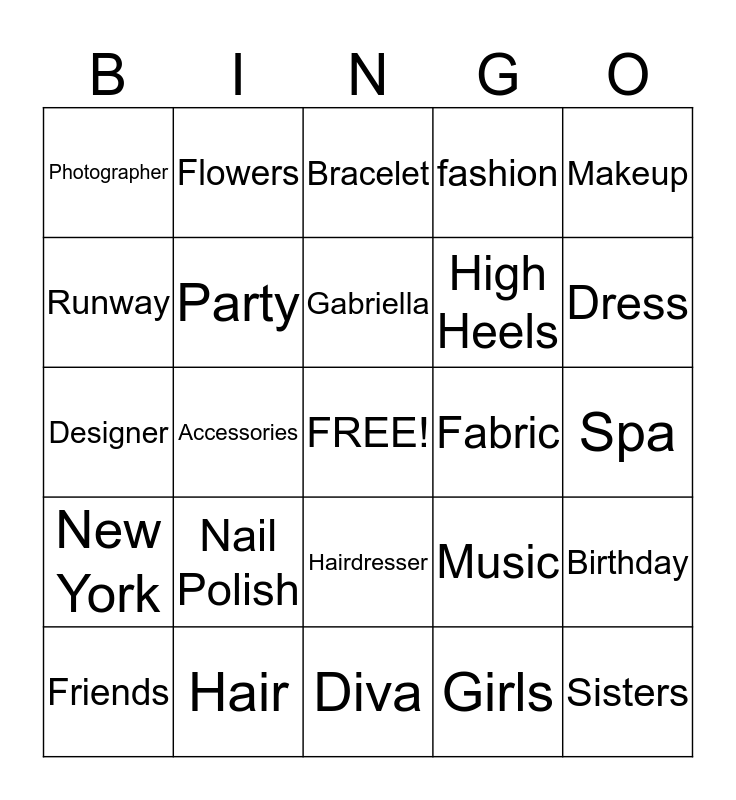 This bingo card has a free space and 24 words: Nail Polish, Hair, Gabriella, Friends, Makeup, Photographer, Runway, Flowers, Fabric, Hairdresser, High Heels, Designer, Music, Birthday, Party, Girls, Spa, Bracelet, Dress, Accessories, Sisters, New York, fashion and Diva.