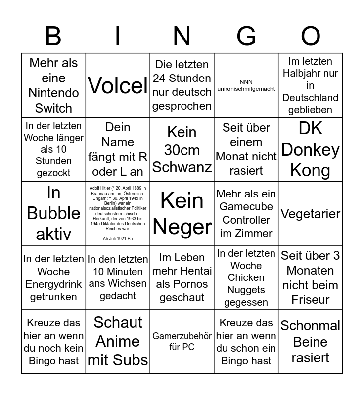 This bingo card has a free space and 24 words: In den letzten 10 Minuten ans Wichsen gedacht, Schaut Anime mit Subs, Kein 30cm Schwanz, Kreuze das hier an wenn du noch kein Bingo hast, Im letzten Halbjahr nur in Deutschland geblieben, Mehr als eine Nintendo Switch, In der letzten Woche länger als 10 Stunden gezockt, Volcel, Mehr als ein Gamecube Controller im Zimmer, Im Leben mehr Hentai als Pornos geschaut, Seit über einem Monat nicht rasiert, In Bubble aktiv, In der letzten Woche Chicken Nuggets gegessen, Seit über 3 Monaten nicht beim Friseur, Dein Name fängt mit R oder L an, Kreuze das hier an wenn du schon ein Bingo hast, Vegetarier, Die letzten 24 Stunden nur deutsch gesprochen, DK Donkey Kong, Adolf Hitler (* 20. April 1889 in Braunau am Inn, Österreich-Ungarn; † 30. April 1945 in Berlin) war ein nationalsozialistischer Politiker deutschösterreichischer Herkunft, der von 1933 bis 1945 Diktator des Deutschen Reiches war. Ab Juli 1921 Pa, Schonmal Beine rasiert, In der letzten Woche Energydrink getrunken, NNN unironischmitgemacht and Gamerzubehör für PC.