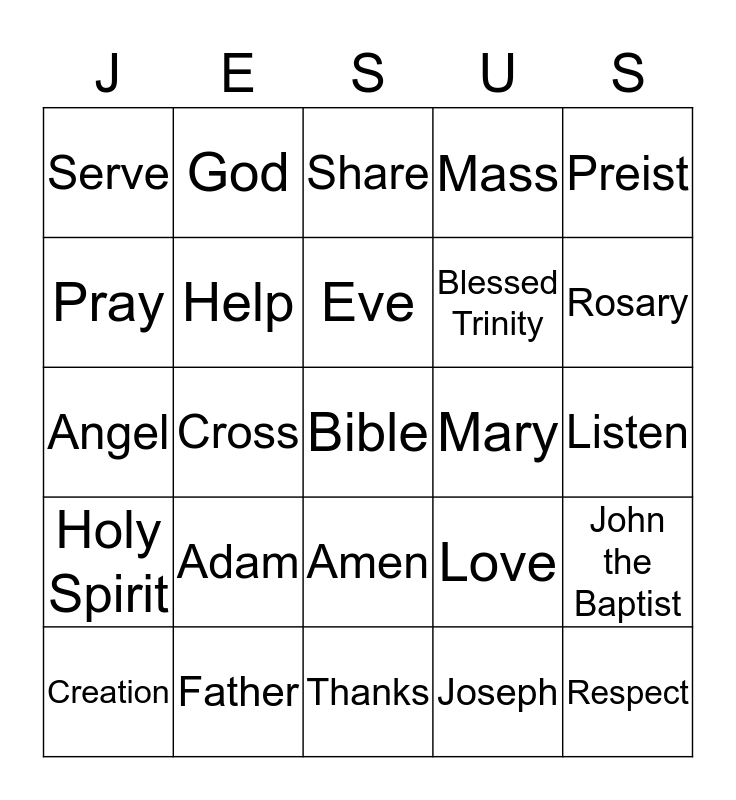 This bingo card has 25 words: Adam, Thanks, Eve, Creation, Preist, Serve, Pray, God, Mary, Amen, Blessed Trinity, Angel, Love, John the Baptist, Help, Respect, Listen, Share, Rosary, Cross, Bible, Father, Holy Spirit, Mass and Joseph.