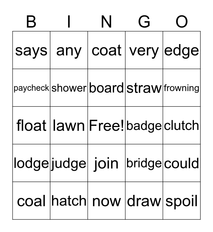 This bingo card has a free space and 29 words: coal, pitch, lawn, coin, says, coat, shower, judge, badge, hatch, clutch, spoil, now, draw, frowning, itch, join, lodge, edge, float, bridge, flower, straw, paycheck, very, any, could, board and done.