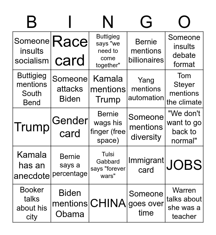 This bingo card has a free space and 24 words: Bernie says a percentage, Biden mentions Obama, Kamala mentions Trump, Booker talks about his city, Someone insults debate format, Someone insults socialism, Buttigieg mentions South Bend, Race card, Someone mentions diversity, Tulsi Gabbard says "forever wars", Yang mentions automation, Trump, Immigrant card, JOBS, Someone attacks Biden, Someone goes over time, "We don't want to go back to normal", Buttigieg says "we need to come together", Tom Steyer mentions the climate, Gender card, Warren talks about she was a teacher, Kamala has an anecdote, Bernie mentions billionaires and CHINA.