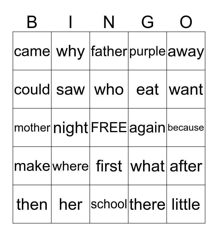 This bingo card has a free space and 24 words: where, her, who, then, away, came, could, why, again, first, eat, mother, what, after, saw, there, because, father, want, night, little, make, purple and school.