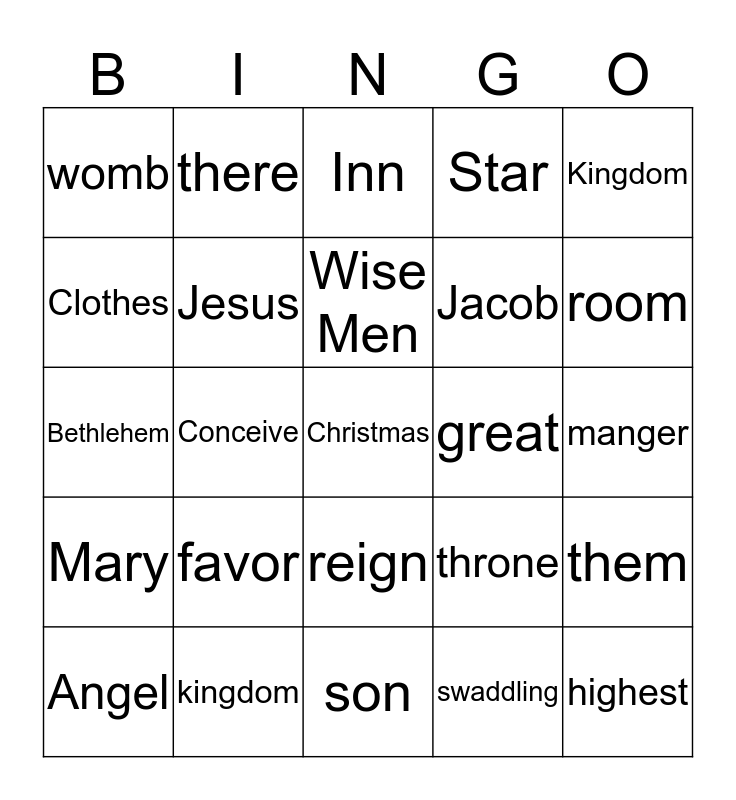 This bingo card has a free space and 29 words: Angel, God, Conceive, fear, womb, Inn, Jesus, favor, great, kingdom, manger, highest, son, swaddling, room, David, reign, Mary, Kingdom, Bethlehem, throne, Herod, Jacob, Clothes, Star, there, them, Wise Men and Search.