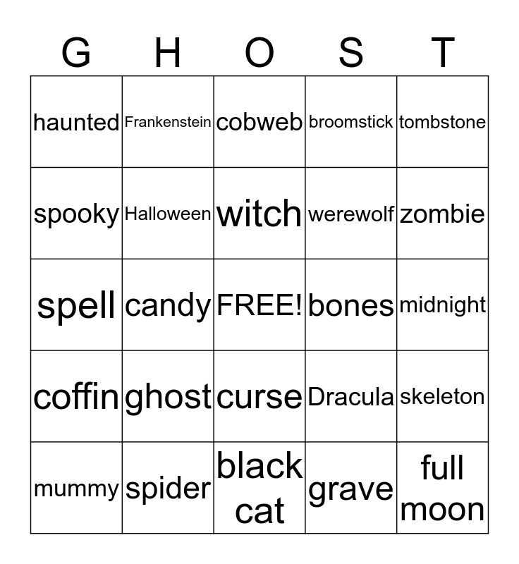 This bingo card has a free space and 27 words: Dracula, shriek, werewolf, black cat, spooky, cobweb, Frankenstein, coffin, bones, skeleton, spell, broomstick, mummy, spider, zombie, bat, Halloween, witch, ghost, haunted, midnight, grave, candy, full moon, curse, tombstone and spirit.