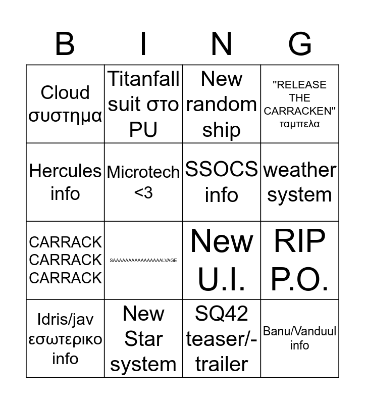 This bingo card has 16 words: New Star system, RIP P.O., New random ship, Cloud συστημα, CARRACK CARRACK CARRACK, Titanfall suit στο PU, New U.I., SQ42 teaser/-trailer, Hercules info, Microtech <3, Idris/jav εσωτερικο info, ''RELEASE THE CARRACKEN'' ταμπελα, SAAAAAAAAAAAAAAAALVAGE, weather system, SSOCS info and Banu/Vanduul info.