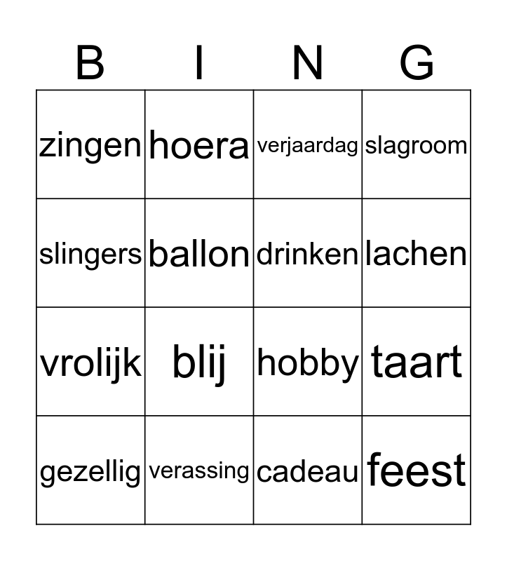 This bingo card has 19 words: hobby, vragen, verjaardag, feest, taart, slingers, cadeau, zingen, hoera, vrolijk, blij, ballon, drinken, verassing, gezellig, opruimen, slagroom, lachen and 21.