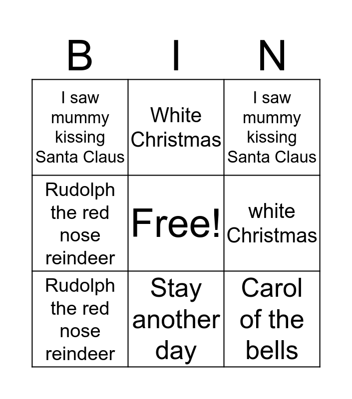 This bingo card has a free space and 9 words: Rudolph the red nose reindeer, I saw mummy kissing Santa Claus, White Christmas, Rudolph the red nose reindeer, I saw mummy kissing Santa Claus, white Christmas, Carol of the bells, Merry Christmas everyone and Stay another day.
