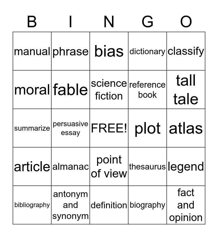 This bingo card has a free space and 24 words: almanac, antonym and synonym, science fiction, bibliography, classify, manual, moral, phrase, plot, point of view, reference book, summarize, thesaurus, legend, fable, biography, atlas, bias, tall tale, persuasive essay, fact and opinion, article, dictionary and definition.