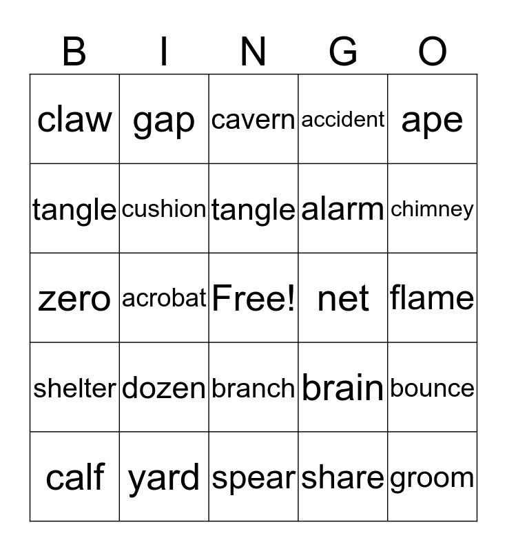 This bingo card has a free space and 29 words: calf, couple, acrobat, yard, claw, cavern, cushion, dozen, net, yard, flame, groom, spear, share, chimney, flap, branch, shelter, ape, zero, brain, enormous, alarm, tangle, accident, gap, bounce, tangle and scoop.
