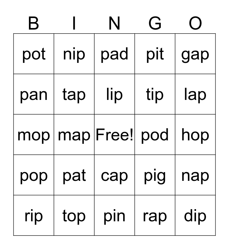 This bingo card has a free space and 24 words: pat, top, lip, rip, gap, pot, pan, nip, pod, cap, tip, mop, pig, nap, tap, rap, hop, pad, lap, map, dip, pop, pit and pin.