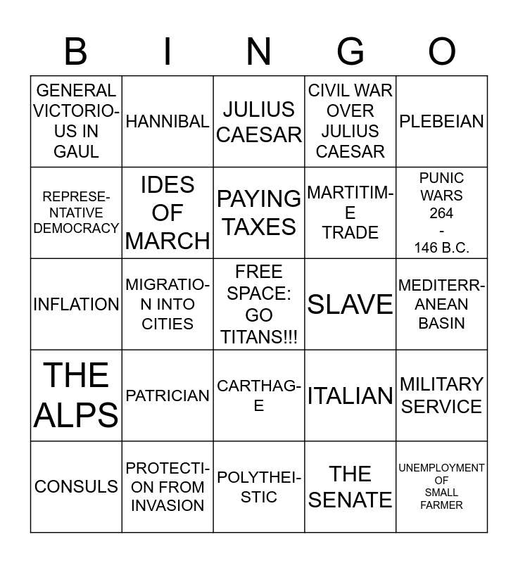This bingo card has a free space and 24 words: PATRICIAN, PROTECTI-ON FROM INVASION, PAYING TAXES, CONSULS, PLEBEIAN, GENERAL VICTORIO-US IN GAUL, REPRESE-NTATIVE DEMOCRACY, HANNIBAL, SLAVE, CARTHAG-E, MARTITIM-E TRADE, INFLATION, ITALIAN, MILITARY SERVICE, IDES OF MARCH, THE SENATE, MEDITERR-ANEAN BASIN, JULIUS CAESAR, PUNIC WARS 264 - 146 B.C., MIGRATIO-N INTO CITIES, UNEMPLOYMENT OF SMALL FARMER, THE ALPS, CIVIL WAR OVER JULIUS CAESAR and POLYTHEI-STIC.