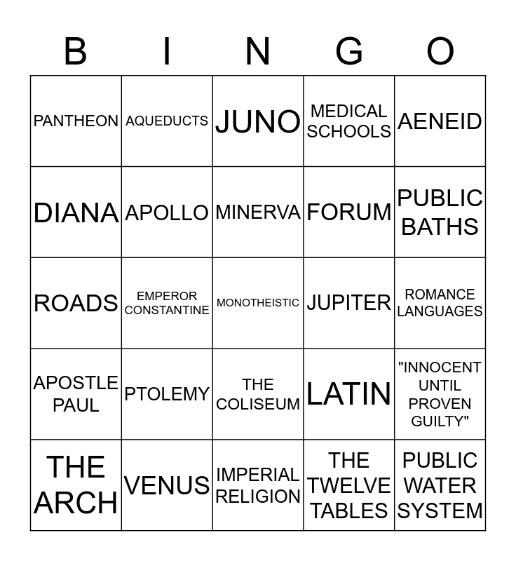 This bingo card has a free space and 24 words: PTOLEMY, VENUS, MINERVA, THE ARCH, AENEID, PANTHEON, DIANA, AQUEDUCTS, JUPITER, THE COLISEUM, FORUM, ROADS, LATIN, "INNOCENT UNTIL PROVEN GUILTY", APOLLO, THE TWELVE TABLES, ROMANCE LANGUAGES, JUNO, PUBLIC BATHS, EMPEROR CONSTANTINE, PUBLIC WATER SYSTEM, APOSTLE PAUL, MEDICAL SCHOOLS and IMPERIAL RELIGION.