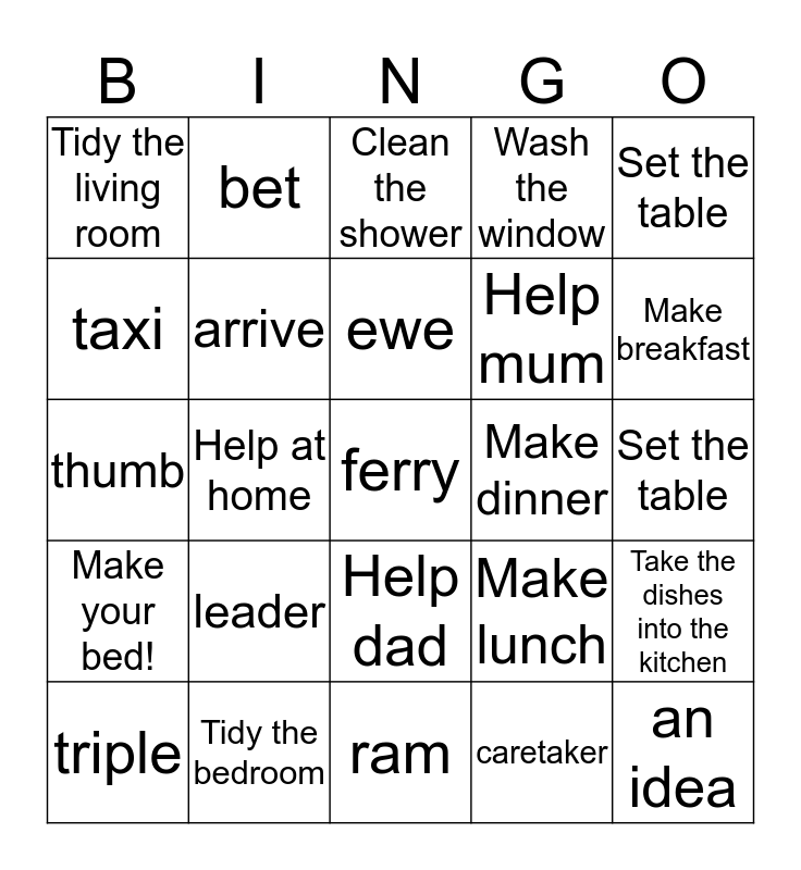 This bingo card has 70 words: Wash the dishes, Set the table, Water the plants, Sweep the floor, Tidy the bedroom, Make the bed, Wash the window, Dry the dishes, Set the table, Tired, Take the dishes into the kitchen, A brush, Tidy the living room, Clean the shower, Wash your face, Help at home, Help dad, Help mum, Clean the floor, Make your bed!, Make dinner, Make lunch, Make breakfast, Make a sandwich, Dustpan, kind, catch, recess, caretaker, helper, bet, my turn, nurse, cook, brave, leace, harbour, boat, firewords, taxi, an idea, leader, ferry, person, island, arrive, triple, later, double, special'agree, quite, different, on foot, hello again, ram, penguim, ewe, grass, finger, witch, thumb, bleed, chiurch, robot, trousers, cloth, clother, foot, dress hand in and point.