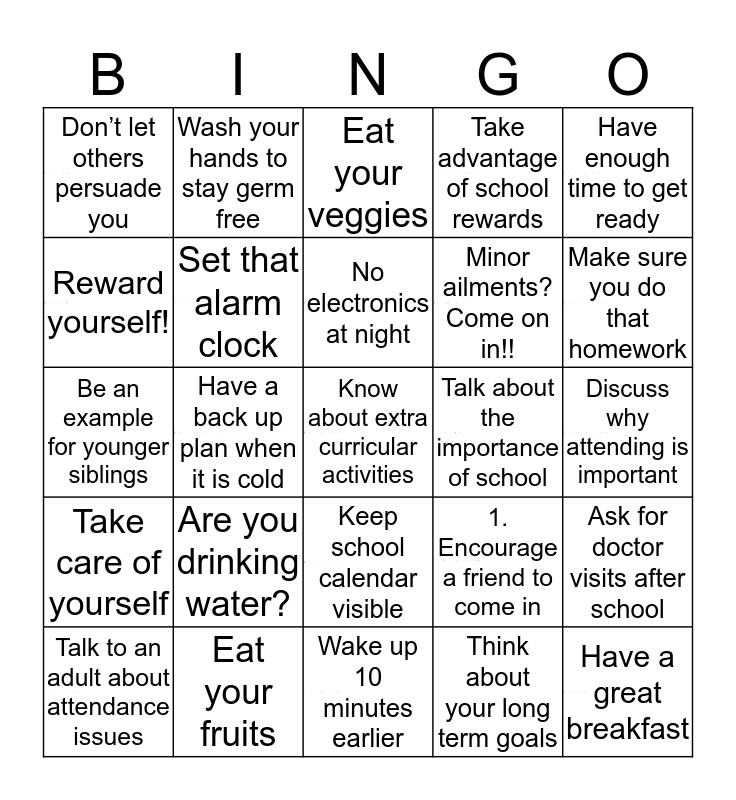 This bingo card has 29 images, a free space and 39 words: Know when important school work is due, Have a buddy system, Set clear attendance goals for yourself, Set that alarm clock, Talk to an adult about attendance issues, Keep school calendar visible, No electronics at night, Brag about your good attendance, Have enough time to get ready, Take care of yourself, Have a back up plan when it is cold, Take advantage of school rewards, Have a great breakfast, Discuss why attending is important, Talk about the importance of school, Are you drinking water?, Provide excuse notes, Don’t let others persuade you, Eat healthy, 1. Encourage a friend to come in, Reward yourself!, Wake up 10 minutes earlier, Minor ailments? Come on in!!, Make sure you do that homework, Keep track of the days you missed, Have uniform ready night before, Ask a classmate why they were out, Have a relaxing bedtime routine, Encourage a friend to come in, Wash your hands to stay germ free, Pack a lunch the night before, Get at least 8 hours of sleep, Eat your veggies, Eat your fruits, Think about your long term goals, Ask your parent for help, Ask for doctor visits after school, Be an example for younger siblings and Stay off screens at bedtime.