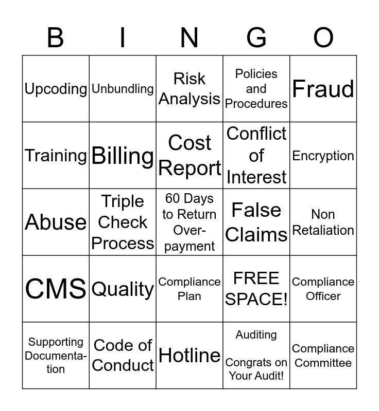 This bingo card has 25 words: Quality, Hotline, Cost Report, Supporting Documenta-tion, Fraud, Upcoding, Training, Unbundling, False Claims, Compliance Plan, Conflict of Interest, Abuse, FREE SPACE!, Compliance Officer, Billing, Compliance Committee, Non Retaliation, Risk Analysis, Encryption, Triple Check Process, 60 Days to Return Over- payment, Code of Conduct, CMS, Policies and Procedures and Auditing Congrats on Your Audit!.