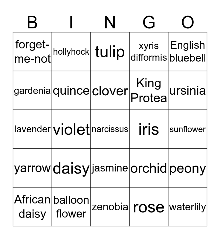 This bingo card has a free space and 24 words: daisy, balloon flower, clover, African daisy, English bluebell, forget-me-not, gardenia, hollyhock, iris, jasmine, King Protea, lavender, orchid, peony, quince, rose, sunflower, tulip, ursinia, violet, waterlily, yarrow, xyris difformis and zenobia.