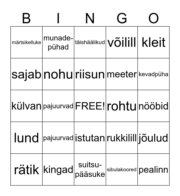 This bingo card has a free space and 24 words: pajuurvad, kingad, riisun, rätik, kleit, märtsikelluke, sajab, munade-pühad, rohtu, istutan, meeter, külvan, rukkilill, jõulud, nohu, sibulakoored, nööbid, täishäälikud, kevadpüha, pajuurvad, pealinn, lund, võilill and suitsu-pääsuke.