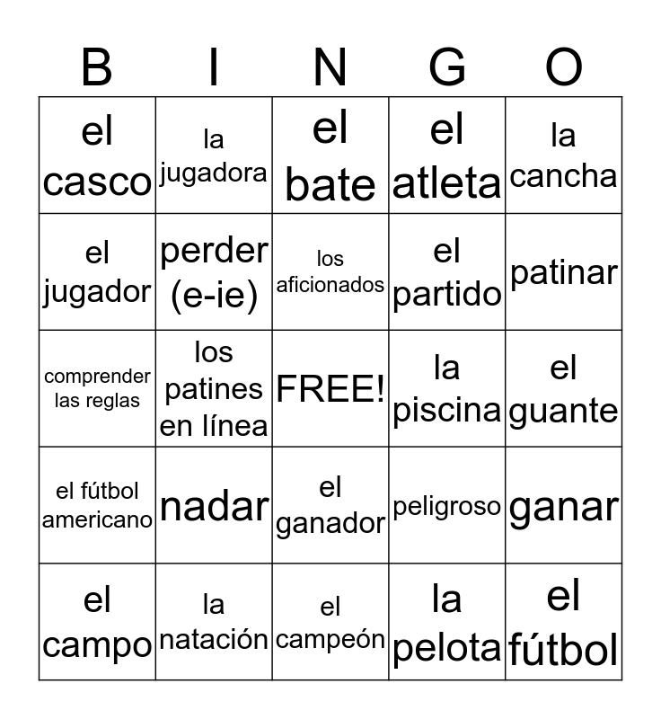 This bingo card has a free space and 24 words: nadar, la natación, los aficionados, el campo, la cancha, el casco, el jugador, la jugadora, la piscina, el ganador, el partido, comprender las reglas, peligroso, ganar, perder (e-ie), la pelota, el guante, el bate, patinar, los patines en línea, el fútbol, el fútbol americano, el atleta and el campeón.