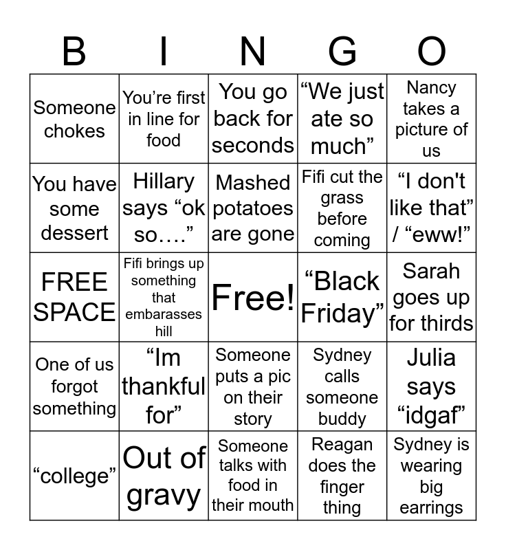 This bingo card has a free space and 33 words: Julia threatens to hurt someone, Someone spills something, Fifi brings up something that embarasses hill, Someone burns their mouth, One of us forgot something, Hillary says “ok so….”, Nancy takes a picture of us, “college”, You’re first in line for food, Reagan says “can we take pics”, Mashed potatoes are gone, You go back for seconds, Chantalle is wearing sweats, Someone brings up christmas /plays xmas music, “Black Friday”, “I don't like that” / “eww!”, Out of gravy, FREE SPACE, “Im thankful for”, Sydney calls someone buddy, Someone puts a pic on their story, Hillary mentions the brick, Someone chokes, Sarah goes up for thirds, Someone talks with food in their mouth, Sydney is wearing big earrings, “We just ate so much”, Fifi cut the grass before coming, You have some dessert, Julia says “idgaf”, “And that’s it” - marg, Reagan does the finger thing and A work story from sarah.