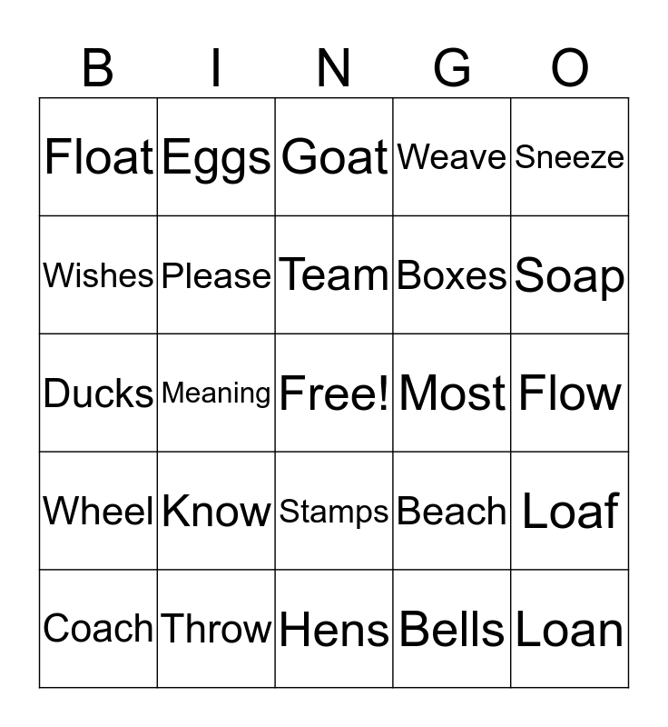 This bingo card has a free space and 36 words: Free, Teach, Teeth, Please, Beach, Wheel, Team, Speak, Sneeze, Sheep, Meaning, Weave, Own, Most, Soap, Float, Both, Know, Loan, Goat, Flow, Loaf, Throw, Coach, Hens, Eggs, Ducks, Bikes, Boxes, Wishes, Dresses, Names, Bells, Stamps, Dishes and Grapes.