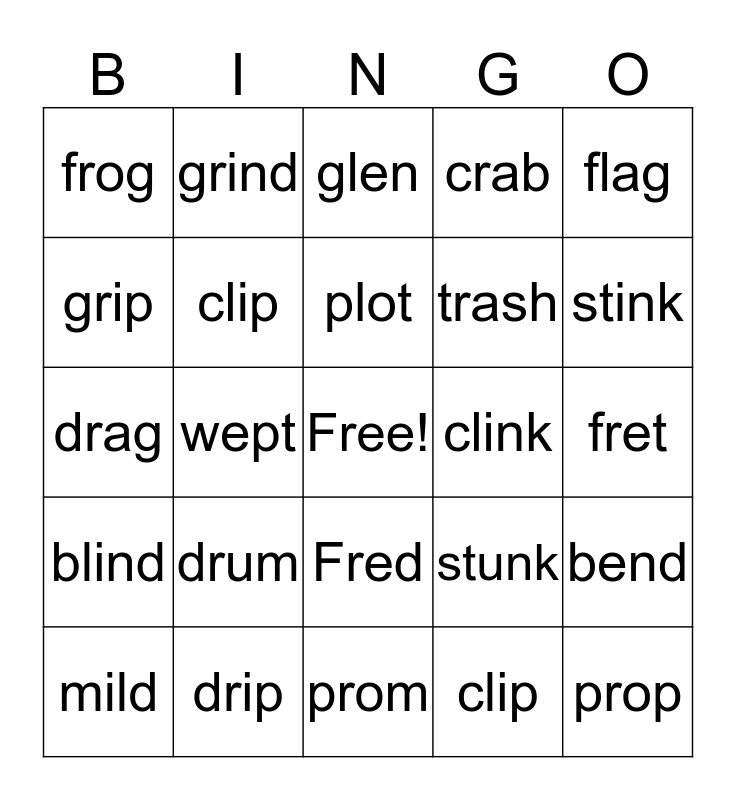 This bingo card has a free space and 34 words: grin, clip, host, find, blind, clip, flag, mild, grind, plum, plot, glen, plop, crop, clink, stink, drip, drag, drum, stunk, Fred, Greg, frog, fret, prom, prop, crab, cling, trash, grip, lend, wept, bend and plug.