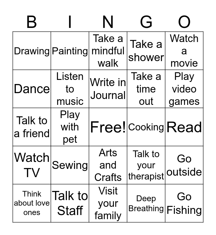 This bingo card has a free space and 27 words: Exercise, Talk to Staff, Write in Journal, Deep Breathing, Watch a movie, Dance, Painting, Visit your family, Cooking, Go outside, Watch TV, Listen to music, Talk to your therapist, Go Fishing, Talk to a friend, Play Cards, Take a mindful walk, Take a shower, Read, Drawing, Sewing, Arts and Crafts, Take a time out, Play video games, Think about love ones, Play with pet and Count to 10.