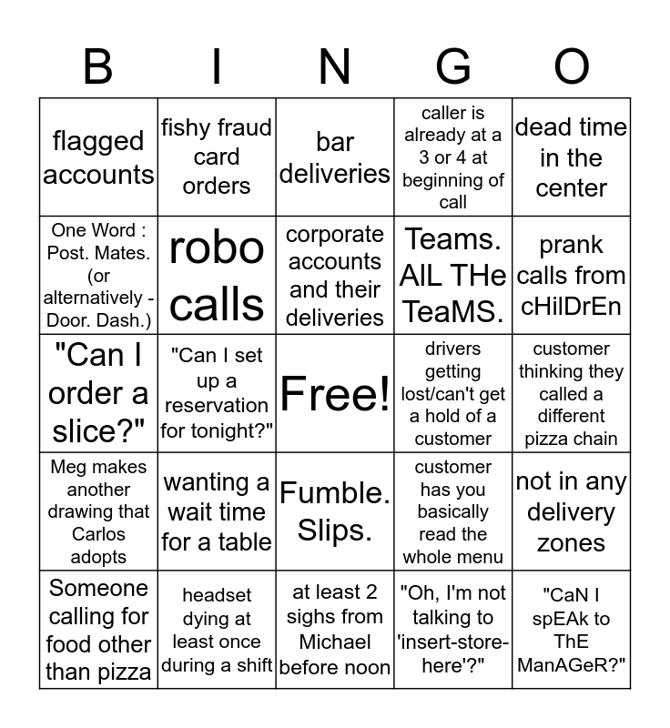 This bingo card has a free space and 24 words: Someone calling for food other than pizza, wanting a wait time for a table, corporate accounts and their deliveries, "Oh, I'm not talking to 'insert-store-here'?", dead time in the center, flagged accounts, fishy fraud card orders, bar deliveries, drivers getting lost/can't get a hold of a customer, customer thinking they called a different pizza chain, "Can I order a slice?", robo calls, customer has you basically read the whole menu, not in any delivery zones, One Word : Post. Mates. (or alternatively - Door. Dash.), headset dying at least once during a shift, at least 2 sighs from Michael before noon, caller is already at a 3 or 4 at beginning of call, prank calls from cHilDrEn, Meg makes another drawing that Carlos adopts, "Can I set up a reservation for tonight?", Fumble. Slips., Teams. AlL THe TeaMS. and "CaN I spEAk to ThE ManAGeR?".