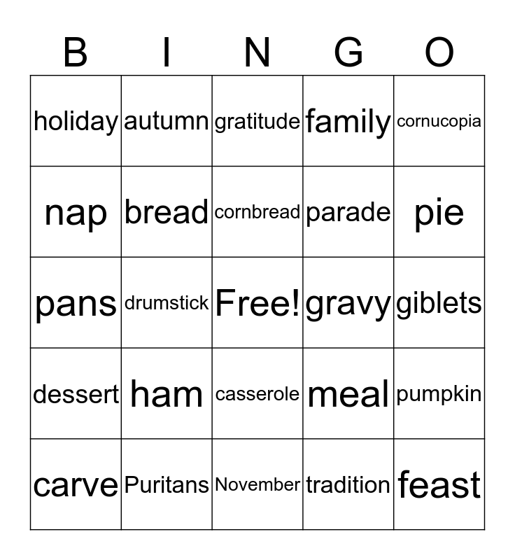 This bingo card has a free space and 39 words: acorns, apple pie, baste, bread, carve, casserole, cornbread, celebrate, cornucopia, dessert, drumstick, family, feast, giblets, gravy, ham, harvest, holiday, Mayflower, meal, nap, November, parade, pie, pilgrims, squash, turkey, wishbone, gobble, autumn, centerpiece, Cook Cori, gratitude, Puritans, tradition, sweet potatoes, pumpkin, pans and oven.