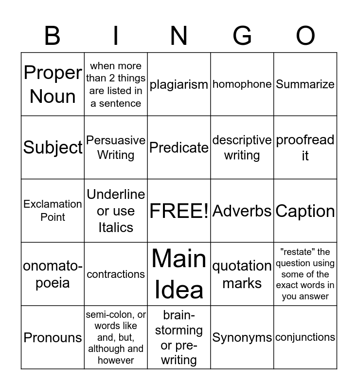 This bingo card has a free space and 24 words: contractions, semi-colon, or words like and, but, although and however, Predicate, Pronouns, Summarize, Proper Noun, Subject, when more than 2 things are listed in a sentence, Adverbs, Main Idea, descriptive writing, Exclamation Point, quotation marks, "restate" the question using some of the exact words in you answer, Persuasive Writing, Synonyms, Caption, plagiarism, proofread it, Underline or use Italics, conjunctions, onomato-poeia, homophone and brain-storming or pre-writing.