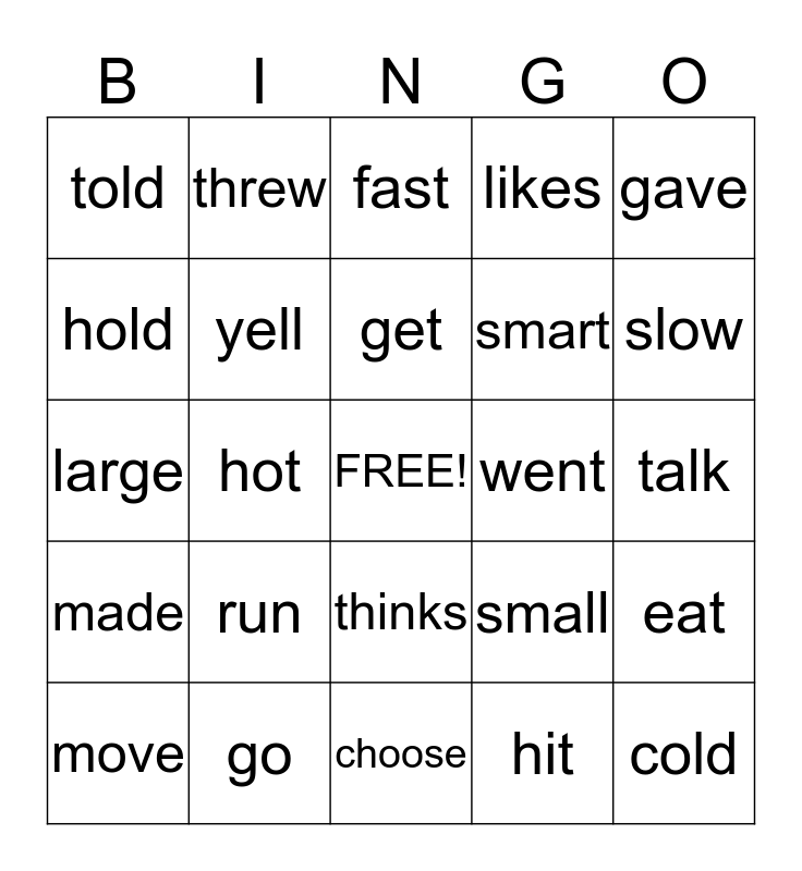 This bingo card has a free space and 24 words: run, go, get, move, gave, told, hold, threw, went, thinks, smart, large, small, eat, yell, hit, talk, fast, slow, hot, cold, made, likes and choose.