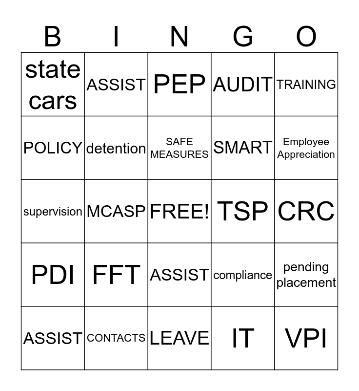 This bingo card has a free space and 24 words: FFT, CONTACTS, SAFE MEASURES, ASSIST, TRAINING, state cars, POLICY, ASSIST, TSP, ASSIST, SMART, supervision, compliance, pending placement, detention, IT, CRC, PEP, Employee Appreciation, MCASP, VPI, PDI, AUDIT and LEAVE.