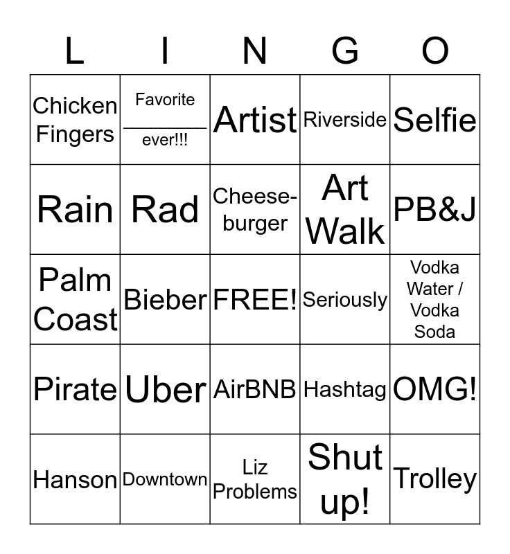 This bingo card has a free space and 24 words: Uber, Downtown, Cheese- burger, Hanson, Selfie, Chicken Fingers, Rain, Favorite _________ ever!!!, Seriously, AirBNB, Art Walk, Palm Coast, Hashtag, OMG!, Rad, Shut up!, Vodka Water / Vodka Soda, Artist, PB&J, Bieber, Trolley, Pirate, Riverside and Liz Problems.
