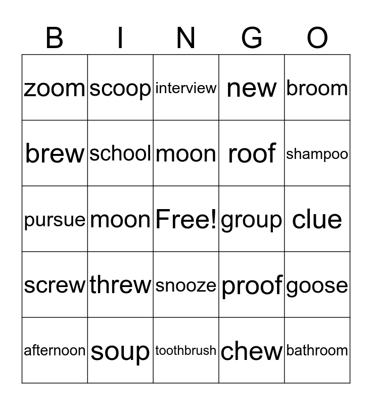 This bingo card has a free space and 34 words: true, chew, toucan, cartoon, screw, school, broom, afternoon, scoop, glue, moon, interview, blue, smooth, group, shampoo, soup, pursue, threw, proof, snooze, cashew, zoom, clue, toothbrush, bathroom, new, rooster, roof, brew, soup, moon, goose and hoot.