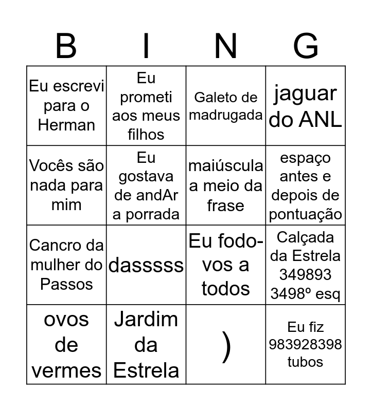 This bingo card has 16 words: Jardim da Estrela, Calçada da Estrela 349893 3498º esq, Galeto de madrugada, Eu escrevi para o Herman, Cancro da mulher do Passos, Eu prometi aos meus filhos, Eu fodo-vos a todos, ), Vocês são nada para mim, Eu gostava de andAr a porrada, ovos de vermes, jaguar do ANL, dasssss, espaço antes e depois de pontuação, maiúscula a meio da frase and Eu fiz 983928398 tubos.