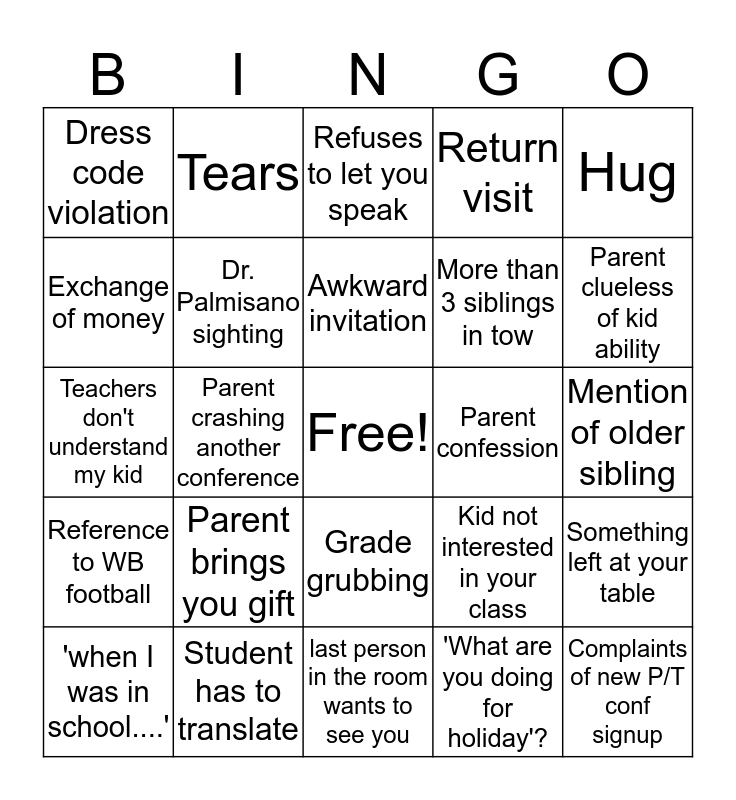 This bingo card has a free space and 24 words: Parent brings you gift, Student has to translate, Awkward invitation, 'when I was in school....', Hug, Dress code violation, Exchange of money, Tears, Parent confession, Grade grubbing, More than 3 siblings in tow, Teachers don't understand my kid, Kid not interested in your class, Something left at your table, Dr. Palmisano sighting, 'What are you doing for holiday'?, Mention of older sibling, Refuses to let you speak, Parent clueless of kid ability, Parent crashing another conference, Complaints of new P/T conf signup, Reference to WB football, Return visit and last person in the room wants to see you.