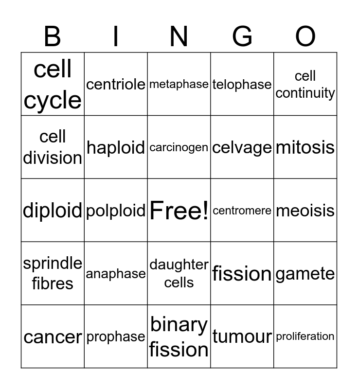 This bingo card has a free space and 25 words: anaphase, binary fission, carcinogen, cancer, cell continuity, cell cycle, cell division, centriole, centromere, daughter cells, celvage, diploid, fission, gamete, haploid, interphase, meoisis, metaphase, mitosis, polploid, proliferation, prophase, sprindle fibres, telophase and tumour.