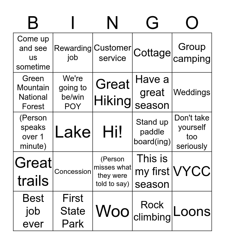 This bingo card has a free space and 24 words: Concession, First State Park, Great Hiking, Best job ever, Group camping, Come up and see us sometime, Green Mountain National Forest, Rewarding job, Stand up paddle board(ing), (Person misses what they were told to say), Have a great season, (Person speaks over 1 minute), This is my first season, VYCC, We're going to be/win POY, Rock climbing, Don't take yourself too seriously, Customer service, Weddings, Lake, Loons, Great trails, Cottage and Woo.