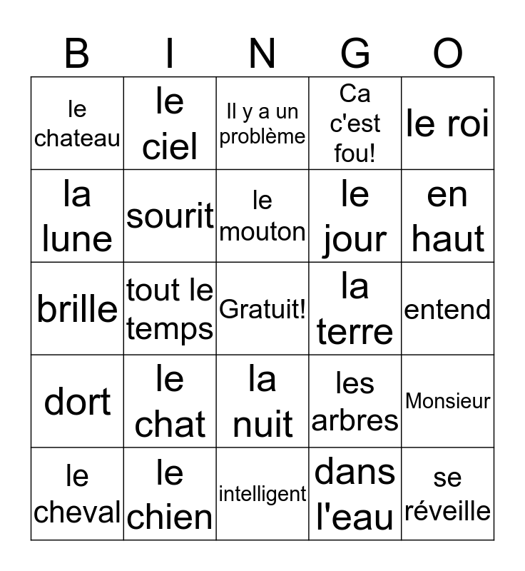 This bingo card has a free space and 24 words: le chat, le chien, le mouton, le cheval, le roi, le chateau, la lune, le ciel, la terre, la nuit, le jour, brille, les arbres, Monsieur, sourit, dans l'eau, entend, Il y a un problème, en haut, tout le temps, se réveille, dort, Ca c'est fou! and intelligent.