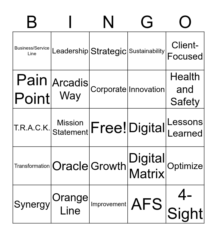 This bingo card has a free space and 29 words: Synergy, Productization, Mission Statement, Engagement, Business/Service Line, Strategic, Arcadis Way, Oracle, Digital, Orange Line, Lessons Learned, 4-Sight, Improvement, AFS, Health and Safety, BIM, Growth, Transformation, Client-Focused, T.R.A.C.K., Digital Matrix, Task Force, Innovation, Pain Point, Sustainability, Leadership, Optimize, Corporate and Solutions.