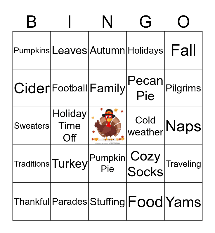 This bingo card has a free space and 24 words: Turkey, Parades, Family, Thankful, Fall, Pumpkins, Cider, Leaves, Cold weather, Pumpkin Pie, Pecan Pie, Sweaters, Cozy Socks, Traveling, Football, Food, Naps, Autumn, Pilgrims, Holiday Time Off, Yams, Traditions, Holidays and Stuffing.