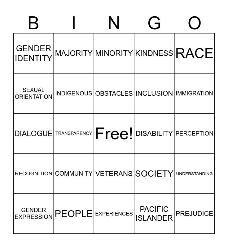 This bingo card has a free space and 82 words: AFFIRMATIVE ACTION, DISCRIMINATION, MINORITY, ETHNICITY, DIVERSITY, VALUES, MULTICULTURAL, CULTURE, CULTURAL COMPETENCY, EQUITY, STEREOTYPES, COLORBLINDNESS, INDIGENOUS, DISABILITY, CISGENDER, GENDER IDENTITY, GENDER EXPRESSION, SEXUAL ORIENTATION, ALLY, BIAS, CIVILITY, INCLUSION, PREJUDICE, RACE, TRANSPARENCY, UNCONSCIOUS BIAS, ACCEPTANCE, ADVOCACY, CIVIL RIGHTS, CELEBRATION, COMMUNITY, DIGNITY, DIALOGUE, EDUCATION, EQUALITY, EXPERIENCES, FAMILY, FREEDOM, IMMIGRATION, IMPACT, INCLUSION, KINDNESS, KINSHIP, SERVICE, LOVE, MAJORITY, MOVEMENT, OBSTACLES, OPPORTUNITY, OVERCOME, PEACE, PERCEPTION, PEOPLE, POTENTIAL, PREJUDICE, RACISM, RESPECT, RESPONSIBILITY, RIGHTS, SOCIETY, SPIRIT, SUPPORT, RECOGNITION, LEGISLATION, ENLIGHTEN, ENVIRONMENT, CONVERSATION, ACTION, RESOURCE, ASIAN AMERICAN, AFRICAN AMERICAN, NATIVE AMERICAN, VETERANS, PACIFIC ISLANDER, HISPANIC, LATINX, WOMEN, YOUTH, SYMBOL, TOLERANCE, UNDERSTANDING and VISION.