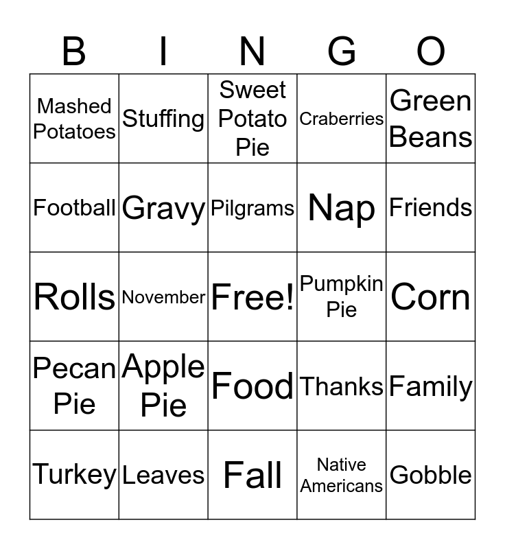 This bingo card has a free space and 24 words: Turkey, Apple Pie, Pilgrams, Native Americans, Green Beans, Mashed Potatoes, Stuffing, Sweet Potato Pie, Pumpkin Pie, Corn, Rolls, Gravy, Thanks, Family, Football, Leaves, Fall, Craberries, Friends, Pecan Pie, November, Food, Nap and Gobble.