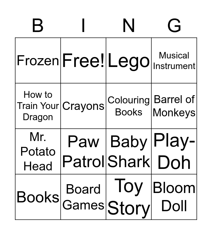 This bingo card has 19 words: Baby Shark, Barbie, Lego, Bloom Doll, Play-Doh, How to Train Your Dragon, Toy Story, Frozen, Free!, Mr. Potato Head, Paw Patrol, Crayons, Colouring Books, Board Games, Books, Unicorn, Musical Instrument, Barrel of Monkeys and Rubik's Cube.