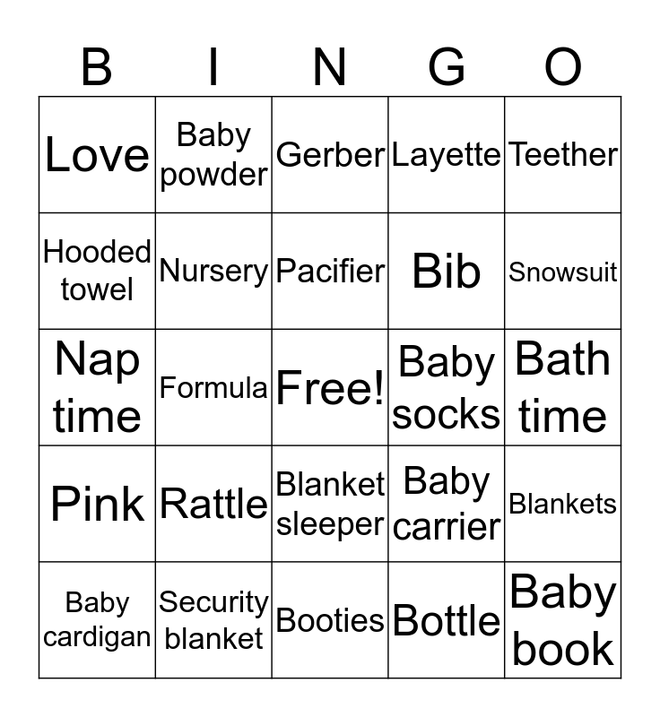 This bingo card has a free space and 73 words: Sippy cup, Baby walker, Love, Diapers, Baby shampoo, Wash cloth, Pink, Ultrasound, Baby carrier, Mittens, Nursery rhyme, Baby Girl, Nursery, Bath time, Toddler, Baby powder, Booties, Hooded towel, High chair, Baby socks, Pacifier, Layette, Teether, Burp cloth, Baby cardigan, Onesie, Carrycot, Lullaby, Mobiles, Stork, Security blanket, Cradle, Milk, Diaper bag, Formula, Towel, Mommy, Newborn, Baby book, Play gym, Bottle, Rattle, Diaper pins, Playpen, Baby Wipes, Bib, Gerber, Blankie, Sleep sack, Nap time, Teething ring, Playsuit, Rubber duck, Baby sling, Baby food, Baby monitor, Baby lotion, Blanket sleeper, Baby swing, Toy box, Bassinet, Baby bathtub, Stroller, Snowsuit, Teddy bear, Bonnet, Bouncy seat, Baby hat, Blankets, Swaddle, Receiving blankets, Rice Cereal and Changing Towel.