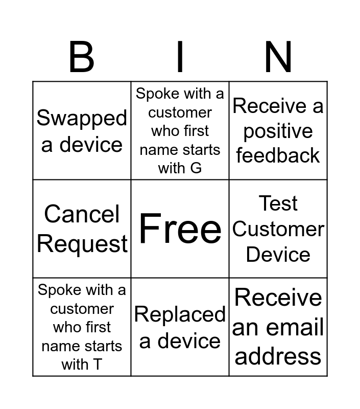 This bingo card has a free space and 9 words: Spoke with a customer who first name starts with T, Receive a positive feedback, Spoke with a customer who first name starts with G, Cancel Request, Swapped a device, Test Customer Device, Receive an email address, Open a credit case and Replaced a device.