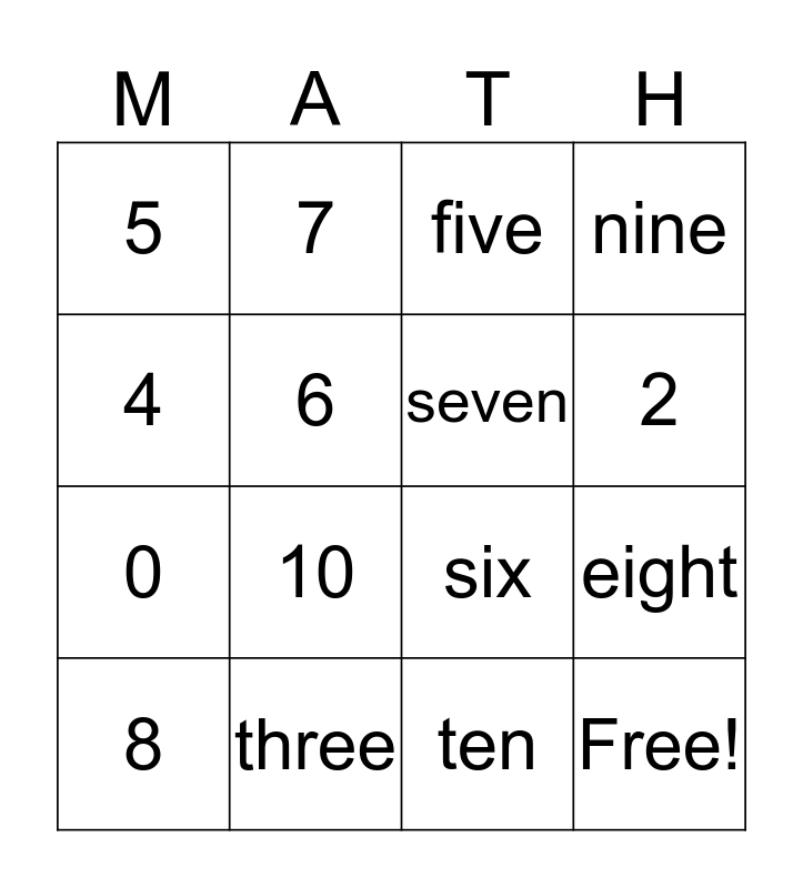 This bingo card has 23 words: Free!, 1, 2, 3, 4, 5, 6, 7, 8, 9, 10, 0, one, two, three, four, five, six, seven, eight, nine, ten and zero.