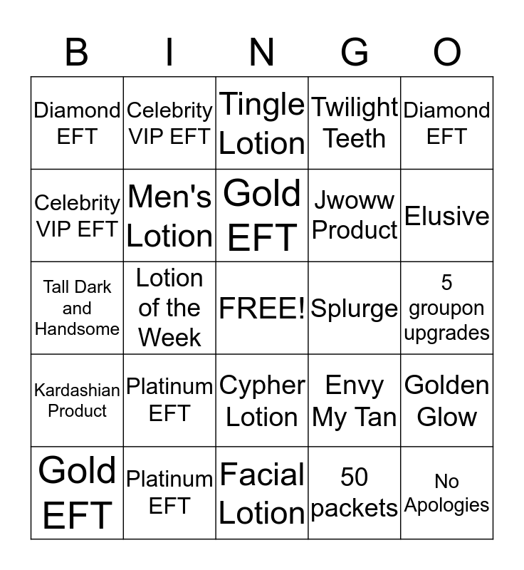This bingo card has a free space and 24 words: Platinum EFT, Platinum EFT, Gold EFT, Gold EFT, Diamond EFT, Diamond EFT, Celebrity VIP EFT, Celebrity VIP EFT, Splurge, Cypher Lotion, Jwoww Product, Tall Dark and Handsome, Envy My Tan, Golden Glow, Men's Lotion, 50 packets, 5 groupon upgrades, Tingle Lotion, Elusive, Lotion of the Week, No Apologies, Kardashian Product, Twilight Teeth and Facial Lotion.