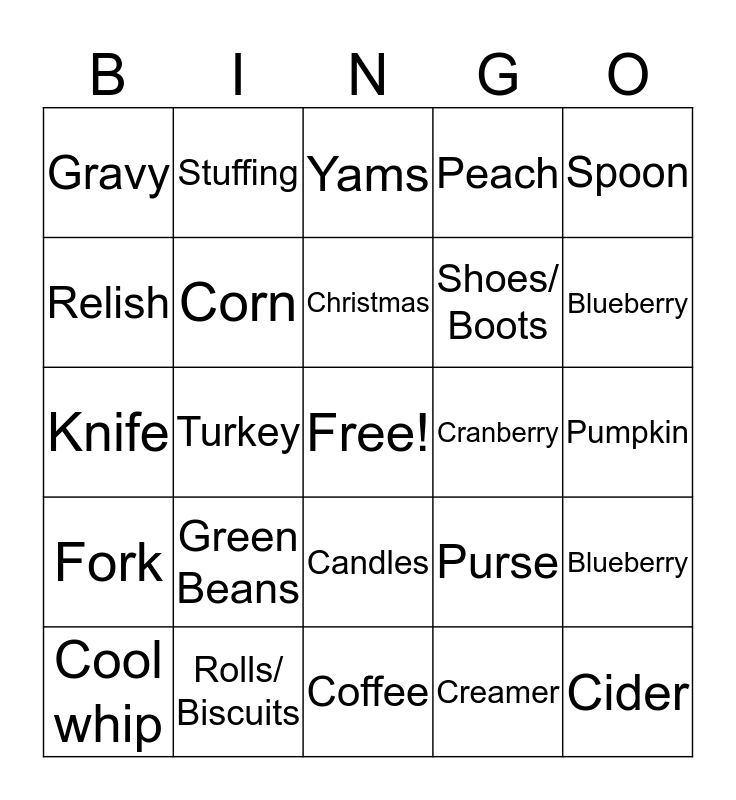 This bingo card has a free space and 29 words: Cool whip, Ham, Turkey, Mashed Potatoes, Gravy, Yams, Corn, Green Beans, Cranberry, Rolls/ Biscuits, Pumpkin, Cider, Coffee, Creamer, Blueberry, Family, Candles, Fork, Spoon, Knife, Purse, Coat, Shoes/ Boots, Relish, Peach, Stuffing, Blueberry, Christmas and Presents.